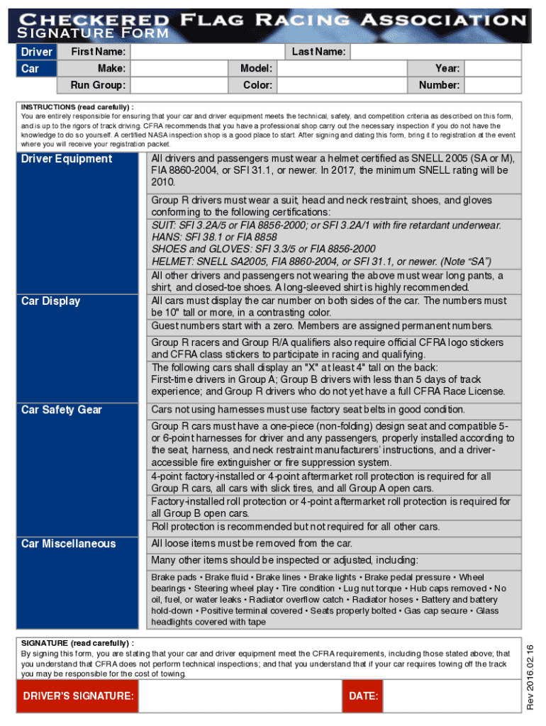 Signature Form Driver CarFirst Name:Last Name:Make:Model:Year:Run Group:Color:Number:INSTRUCTIONS (read carefully) : You are entirely responsible for ensuring that your car and driver equipment meets
