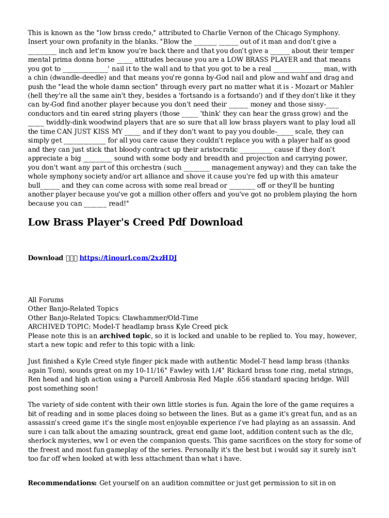 Low brass players, including those who play the bass trombone, euphonium, and tuba, are typically required to file the low brass players creed.