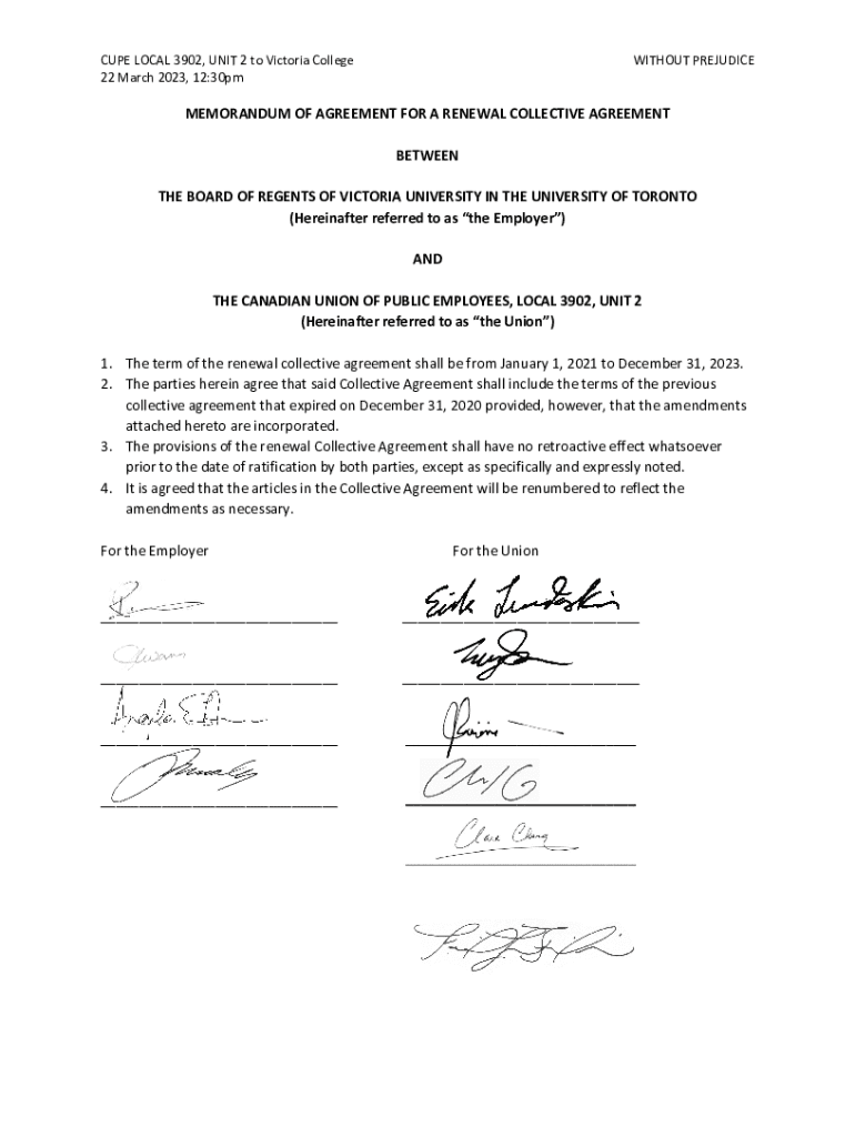 CUPE LOCAL 3902, UNIT 2 to Victoria College 22 March 2023, 12:30pmWITHOUT PREJUDICEMEMORANDUM OF AGREEMENT FOR A RENEWAL COLLECTIVE AGREEMENT BETWEEN THE BOARD OF REGENTS OF VICTORIA UNIVERSITY IN