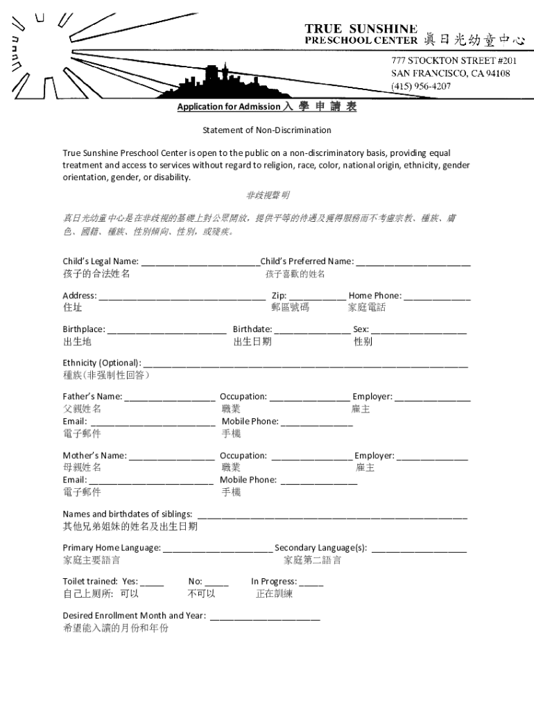 Application for Admission Statement of NonDiscrimination True Sunshine Preschool Center is open to the public on a nondiscriminatory basis, providing equal treatment and access to services without