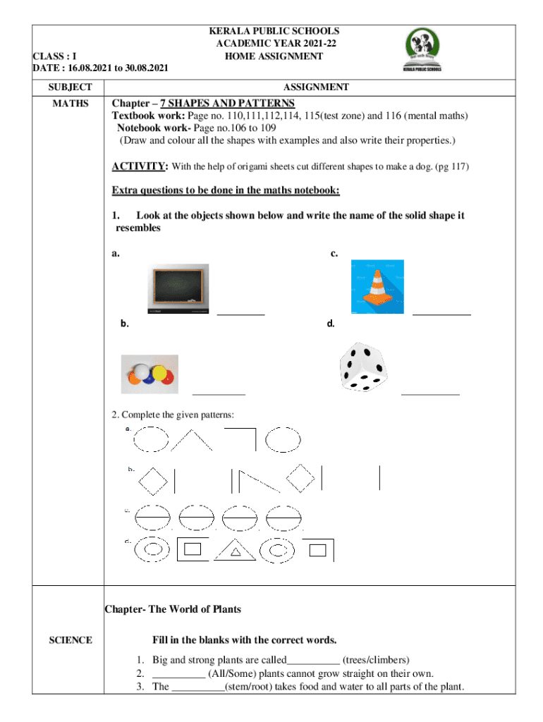 CLASS : I DATE : 16.08.2021 to 30.08.2021KERALA PUBLIC SCHOOLS ACADEMIC YEAR 202122 HOME ASSIGNMENTSUBJECT MATHSASSIGNMENTChapter 7 SHAPES AND PATTERNS Textbook work: Page no. 110,111,112,114, 115(test