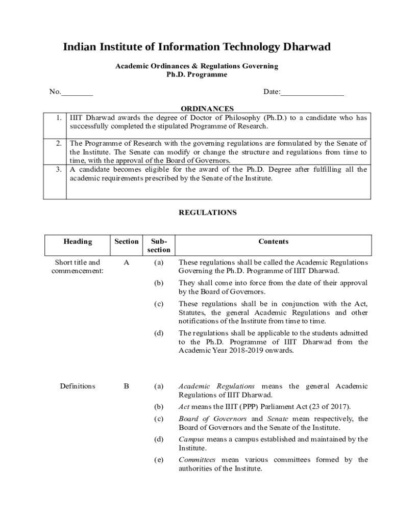 Indian Institute of Information Technology Dharwad Academic Ordinances & Regulations Governing Ph.D. Programme No.___ 1. 2. 3.Date:___ORDINANCES IIIT Dharwad awards the degree of Doctor of Philosophy