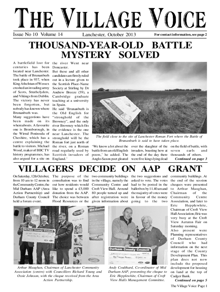 Issue No 10 Volume 14Lanchester, October 2013For contact information, see page 2THOUSANDYEAROLD BATTLE MYSTERY SOLVED A battlefield lost for centuries has been located near Lanchester. The battle