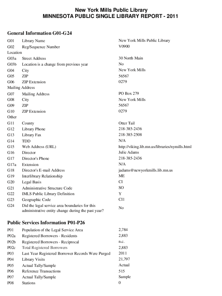 New York Mills Public Library MINNESOTA PUBLIC SINGLE LIBRARY REPORT 2011 General Information G01G24 G01 Library Name G02 Reg/Sequence Number Location G03a Street Address G03b Location is a change