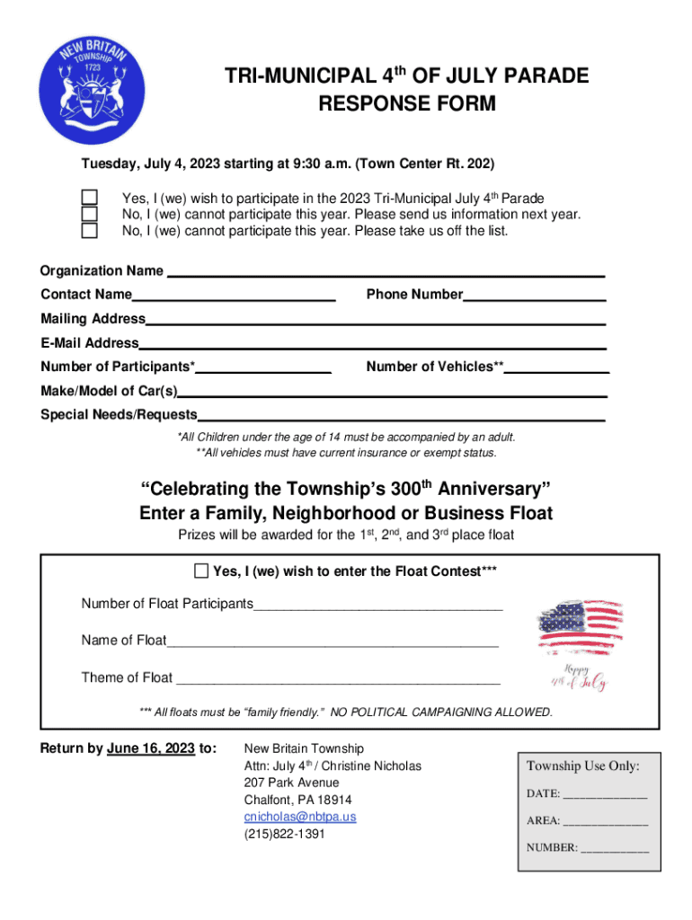 2023 ANNUAL TRIMUNICIPAL 4TH OF JULY PARADE PARADE STARTS AT TOWN CENTER (RT 202) &FOLLOWS RT 202 S TO 152 N, ENDING AT NORTH BRANCH PARK, 207 PARK AVENUE IN CHALFONT.All are welcome! ENTRY Bring