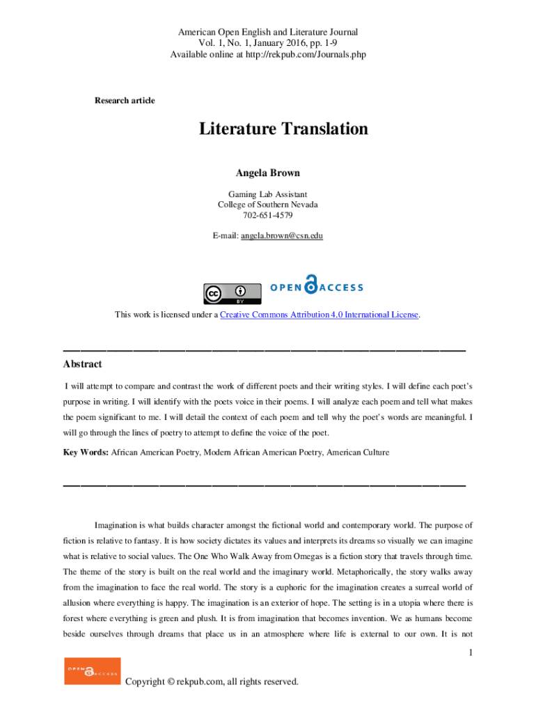 American Open English and Literature Journal Vol. 1, No. 1, January 2016, pp. 19 Available online at http://rekpub.com/Journals.phpResearch articleLiterature Translation Angela Brown Gaming Lab Assistant