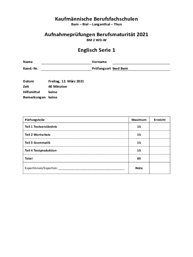 Kaufmnnische Berufsfachschulen Bern Biel Langenthal ThunAufnahmeprfungen Berufsmaturitt 2021 BM 2 WDWEnglisch Serie 1 NameVornameKand.Nr.Prfungsort bwd BernDatum Zeit Hilfsmittel BemerkungenFreitag,