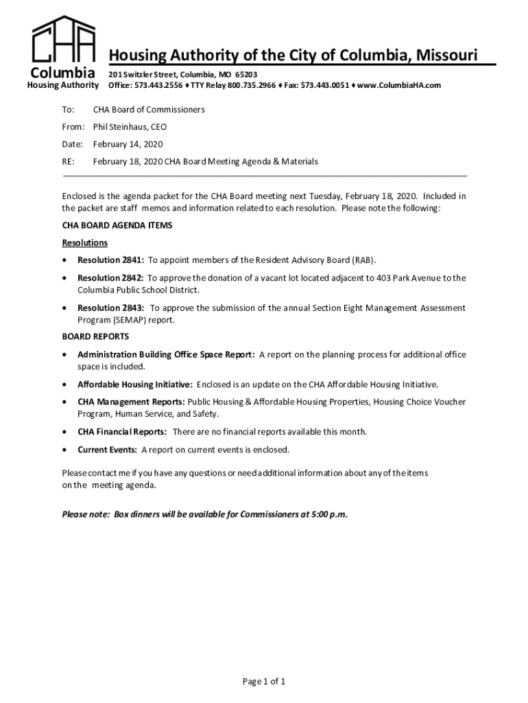 ColumbiaHousing Authority To:Housing Authority of the City of Columbia, Missouri 201 Switzler Street, Columbia, MO 65203 Office: 573.443.2556 TTY Relay 800.735.2966 Fax: 573.443.0051 www.ColumbiaHA.comCHA