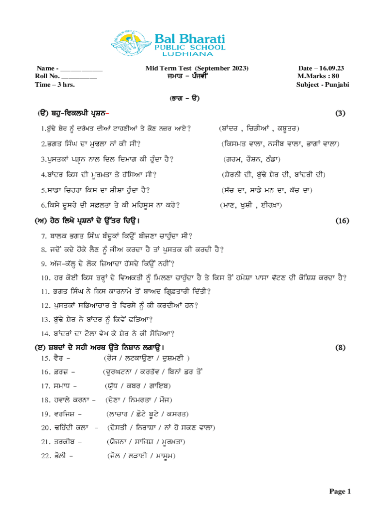 Name ___ Roll No. ___ Time 3 hrs.Mid Term Test (September 2023) jmwq pMjvINDate 16.09.23 M.Marks : 80 Subject Punjabi(Bwg a)(a) bhuivklpI pRSn1.bu`Fy Syr nUM dr`Kq dIAW twhxIAW qy kOx nzr Awey?(3)