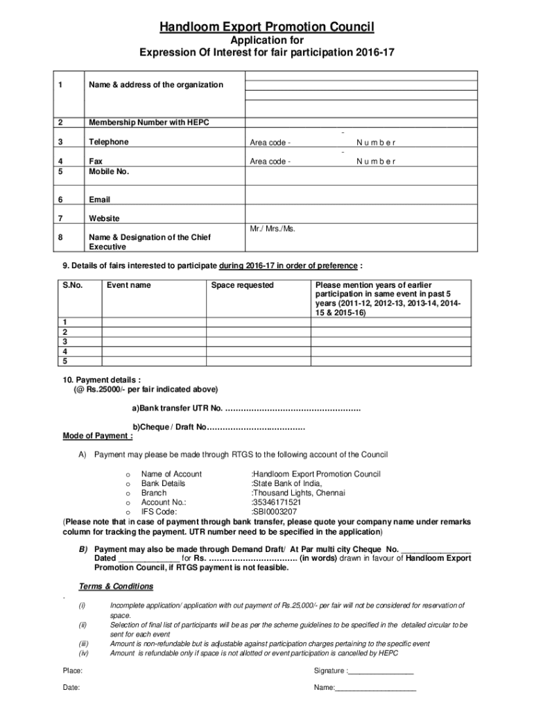 Handloom Export Promotion Council Application for Expression Of Interest for fair participation 201617 1Name & address of the organization2Membership Number with HEPC3TelephoneArea code Number 4 5Fax
