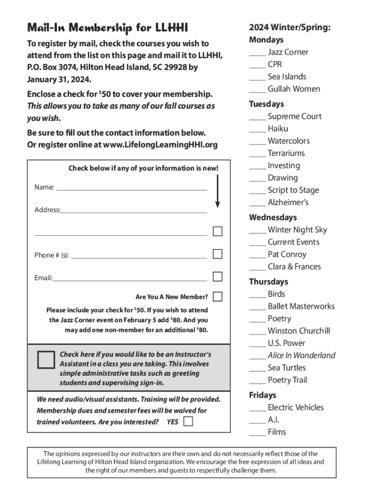 MailIn Membership for LLHHI To register by mail, check the courses you wish to attend from the list on this page and mail it to LLHHI, P.O. Box 3074, Hilton Head Island, SC 29928 by January 31, 2024.