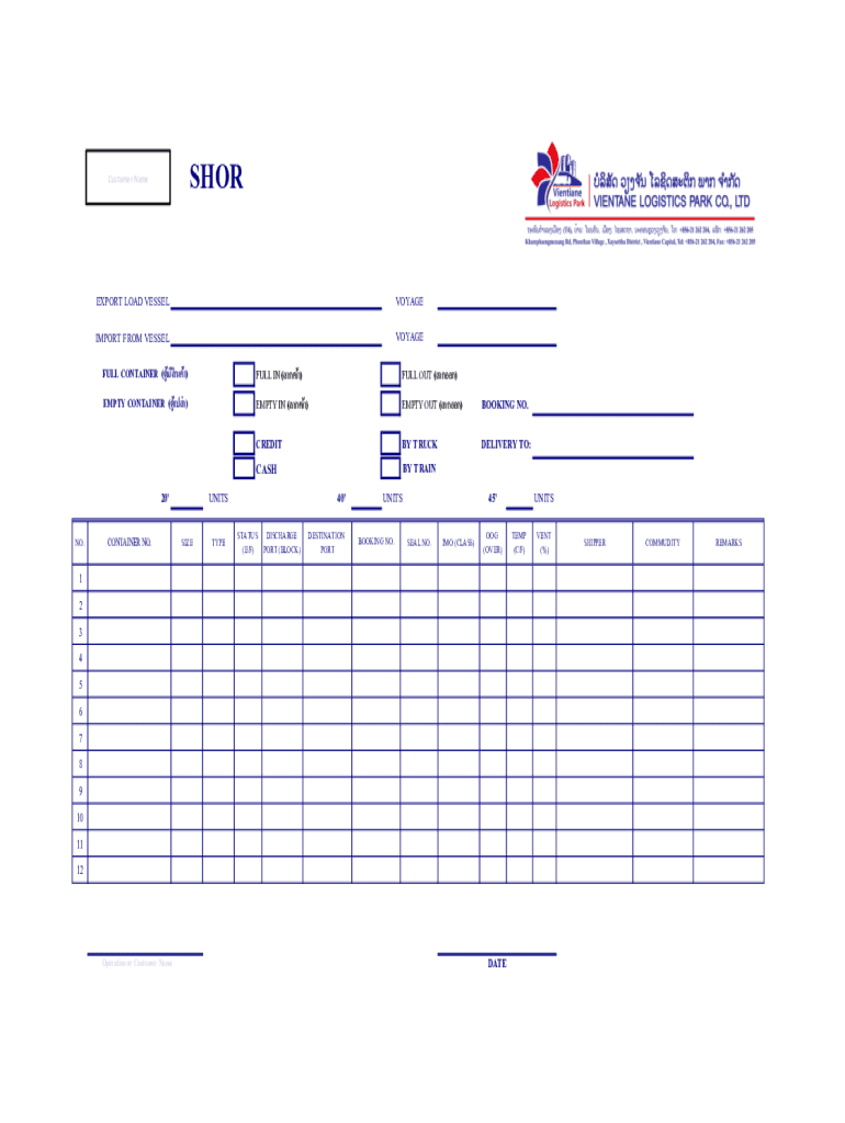 SHORCustomer NameEXPORT LOAD VESSELVOYAGEIMPORT FROM VESSELVOYAGEFULL CONTAINER ( )FULL IN ()FULL OUT ()EMPTY CONTAINER ()EMPTY IN ()EMPTY OUT ()BOOKING NO.CREDITBY TRUCKDELIVERY TO:CASHBY TRAIN20\'NO.CONTAINER