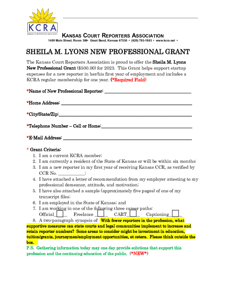 KANSAS COURT REPORTERS ASSOCIATION 1400 Main Street, Room 306 Great Bend, Kansas 67530 (620) 7931863 www.kcra.net SHEILA M. LYONS NEW PROFESSIONAL GRANT The Kansas Court Reporters Association is proud