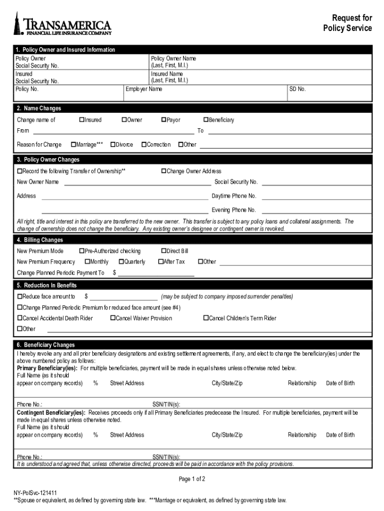 Request for Policy Service 1. Policy Owner and Insured Information Policy Owner Social Security No. Insured Social Security No. Policy No.Policy Owner Name (Last, First, M.I.) Insured Name (Last,