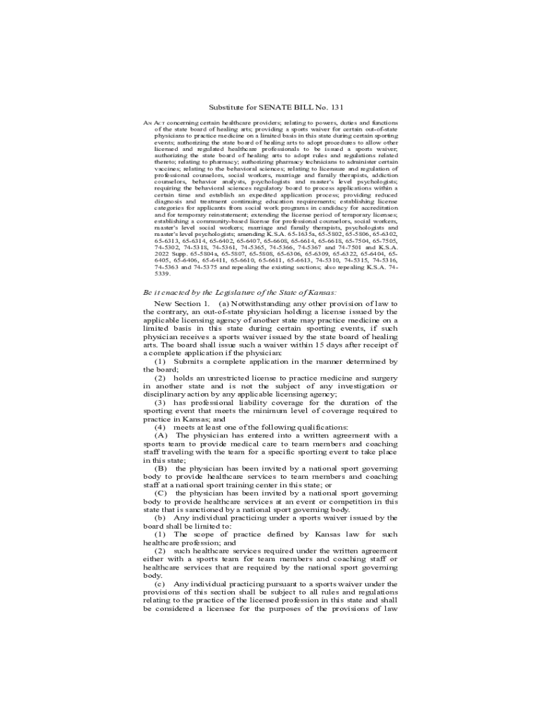 Substitute for SENATE BILL No. 131 AN ACT concerning certain healthcare providers; relating to powers, duties and functions of the state board of healing arts; providing a sports waiver for certain