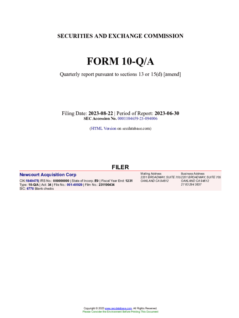 Get the free Newcourt Acquisition Corp Form 10-Q/A Quarterly Report ...