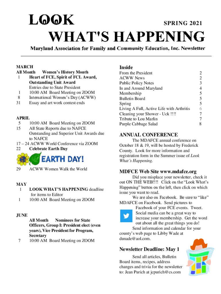 SPRING 2021MARCH All Month Womens History Month 1 Heart of FCE, Spirit of FCL Award, Outstanding Unit Award Entries due to State President 1 10:00 AM Board Meeting on ZOOM 8 International Womens Day