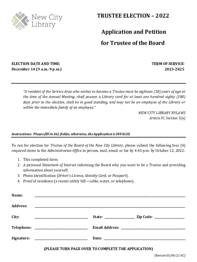 TRUSTEE ELECTION 2022 Application and Petition for Trustee of the BoardELECTION DATE AND TIME: December 14 (9 a.m.9 p.m.)TERM OF SERVICE: 20232025A resident of the Service Area who wishes to become
