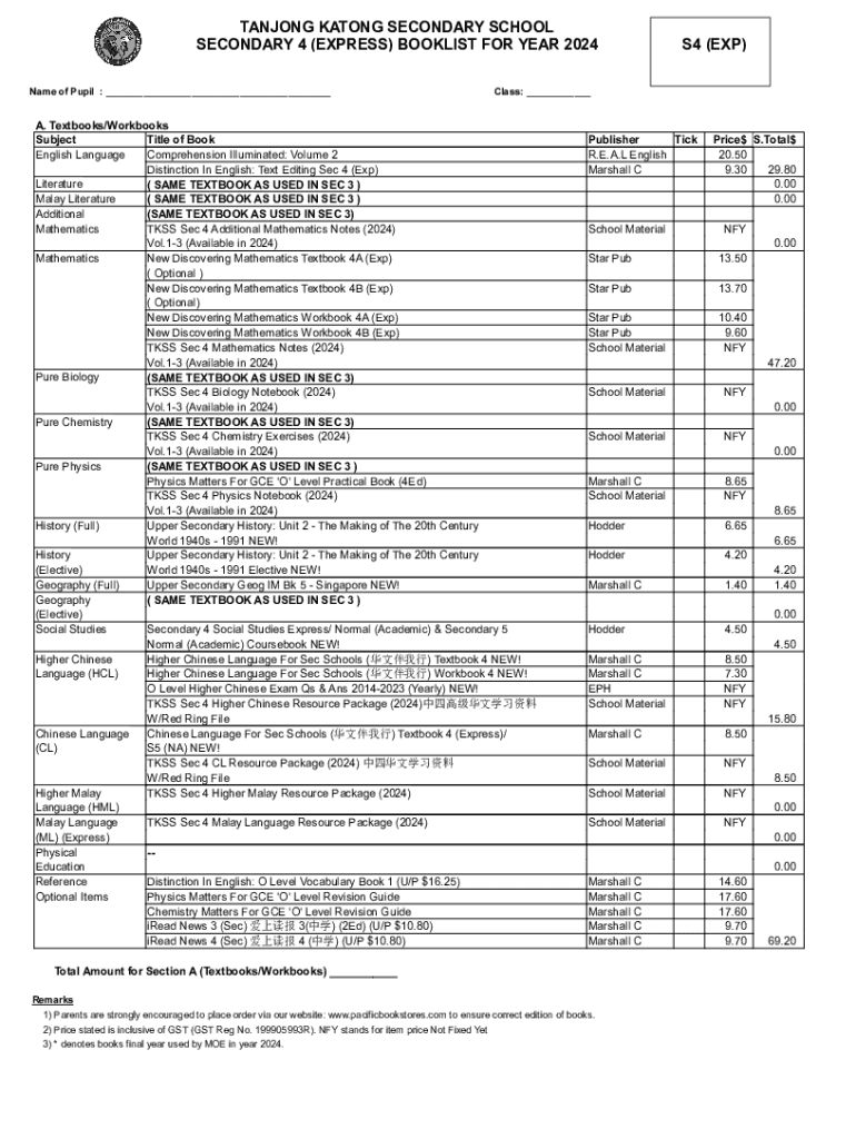 TANJONG KATONG SECONDARY SCHOOL SECONDARY 4 (EXPRESS) BOOKLIST FOR YEAR 2024 Name of Pupil : ___S4 (EXP)Class: ___A. Textbooks/Workbooks Subject Title of Book English Language Comprehension Illuminated: