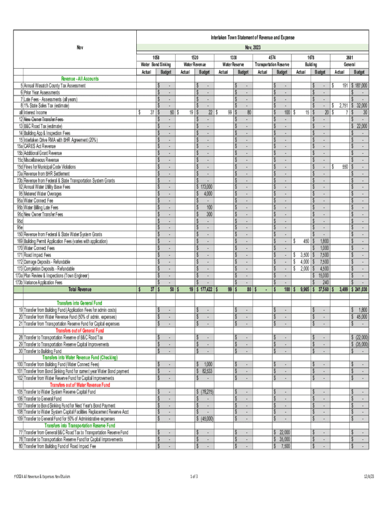 Interlaken Town Statement of Revenue and Expense NovNov, 2023 1058 Water Bond Sinking Actual Budget5 6 7 8 all 12 13 14 15 15a 15b 15c 15d 73a 73b 92 95 95a 95b 95c 95d 95e 150 169 170 171 172 173