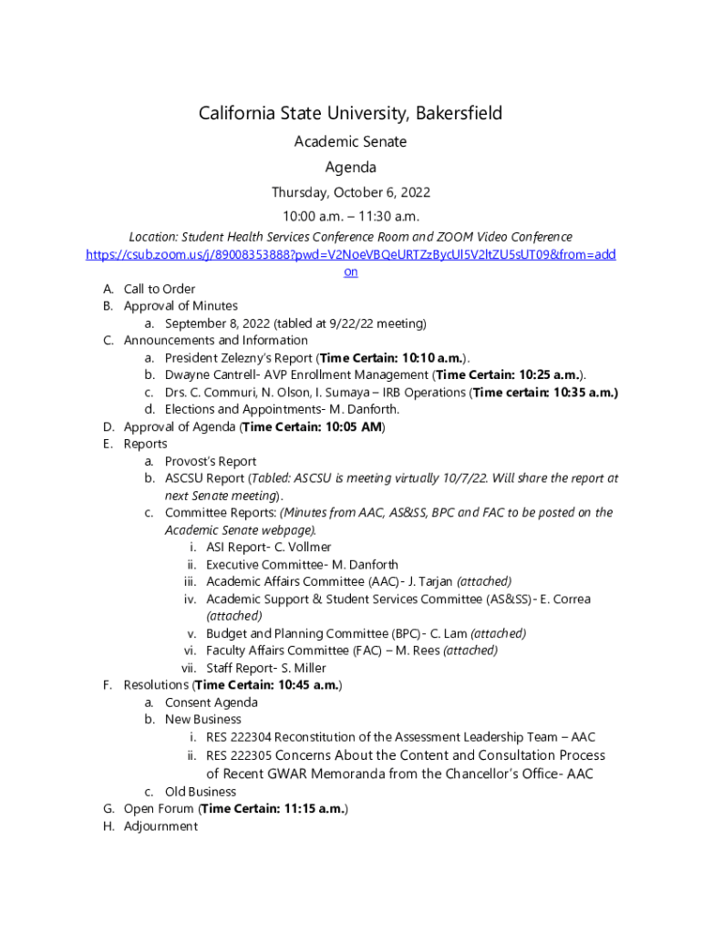 California State University, Bakersfield Academic Senate AgendaThursday, October 6, 2022 10:00 a.m. 11:30 a.m.Location: Student Health Services Conference Room and ZOOM Video Conference https://csub.zoom.us/j/89008353888?pwdV2NoeVBQeURTZzBycUl5V2ltZU5sUT09&fromadd