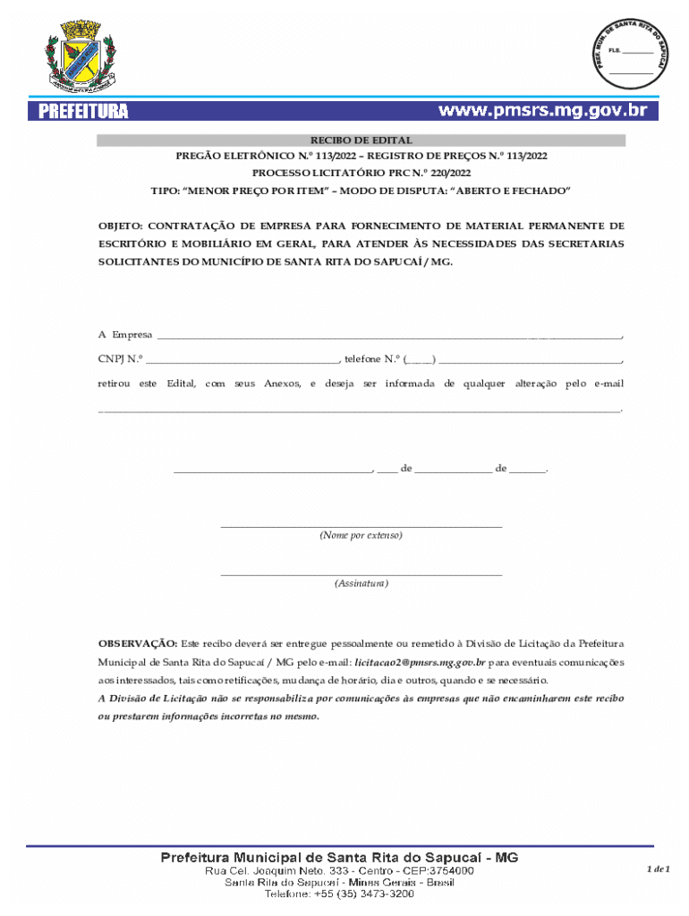 RECIBO DE EDITAL PREGO ELETRNICO N. 113/2022 REGISTRO DE PREOS N. 113/2022 PROCESSO LICITATRIO PRC N. 220/2022 TIPO: MENOR PREO POR ITEM MODO DE DISPUTA: ABERTO E FECHADOOBJETO: CONTRATAO DE EMPRESA