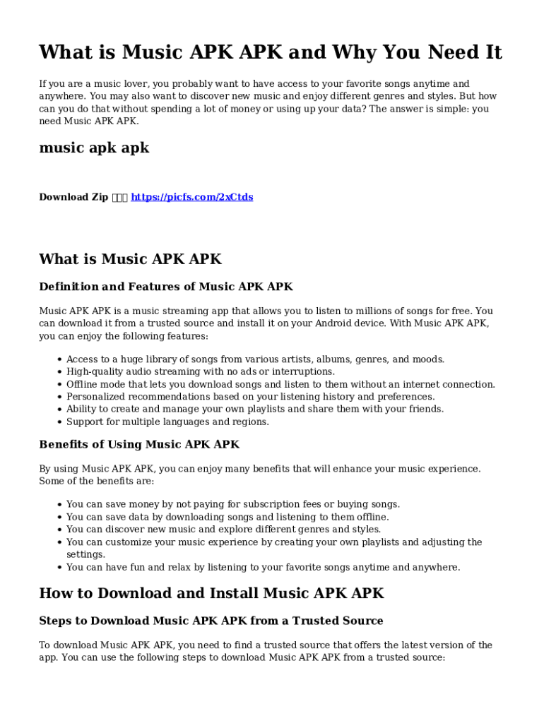 What is Music APK APK and Why You Need It If you are a music lover, you probably want to have access to your favorite songs anytime and anywhere. You may also want to discover new music and enjoy