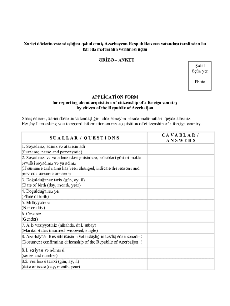 Xarici dvltin vtndaln qbul etmi Azrbaycan Respublikasnn vtnda trfindn bu bard mlumatn verilmsi n RZ ANKET kil n yer Photo APPLCATON FORM for reporting about acquisition of citizenship of a foreign