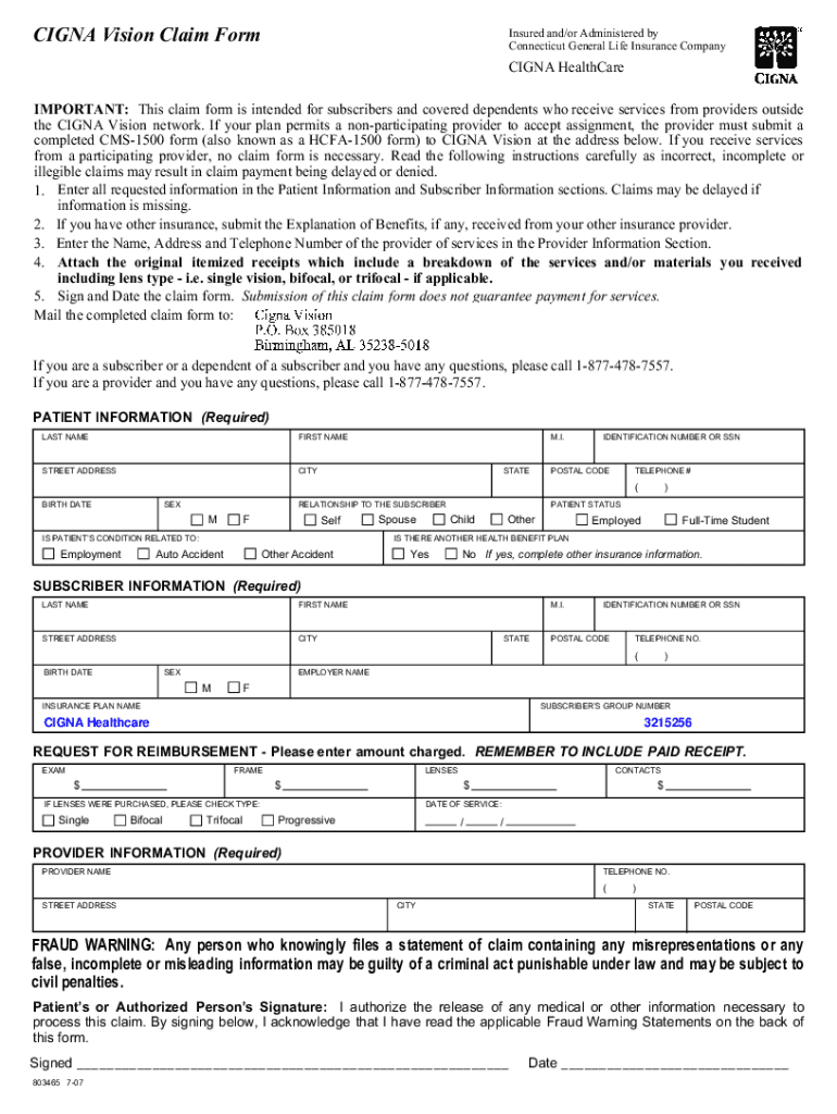 Form InformationCIGNA Vision Claim FormInsured and/or Administered by Connecticut General Life Insurance CompanyCIGNA HealthCare IMPORTANT: This claim form is intended for subscribers and covered