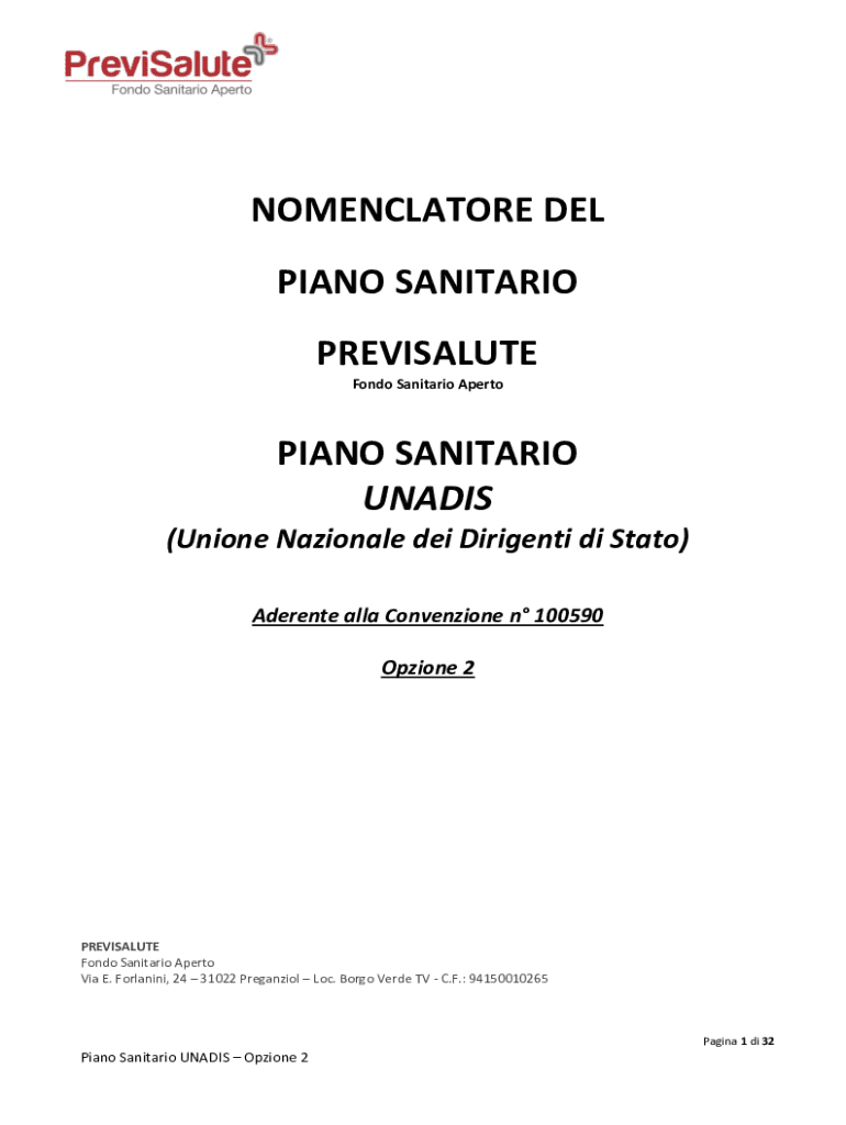NOMENCLATORE DEL PIANO SANITARIO PREVISALUTE Fondo Sanitario ApertoPIANO SANITARIO UNADIS (Unione Nazionale dei Dirigenti di Stato) Aderente alla Convenzione n 100590 Opzione 2PREVISALUTE Fondo Sanitario
