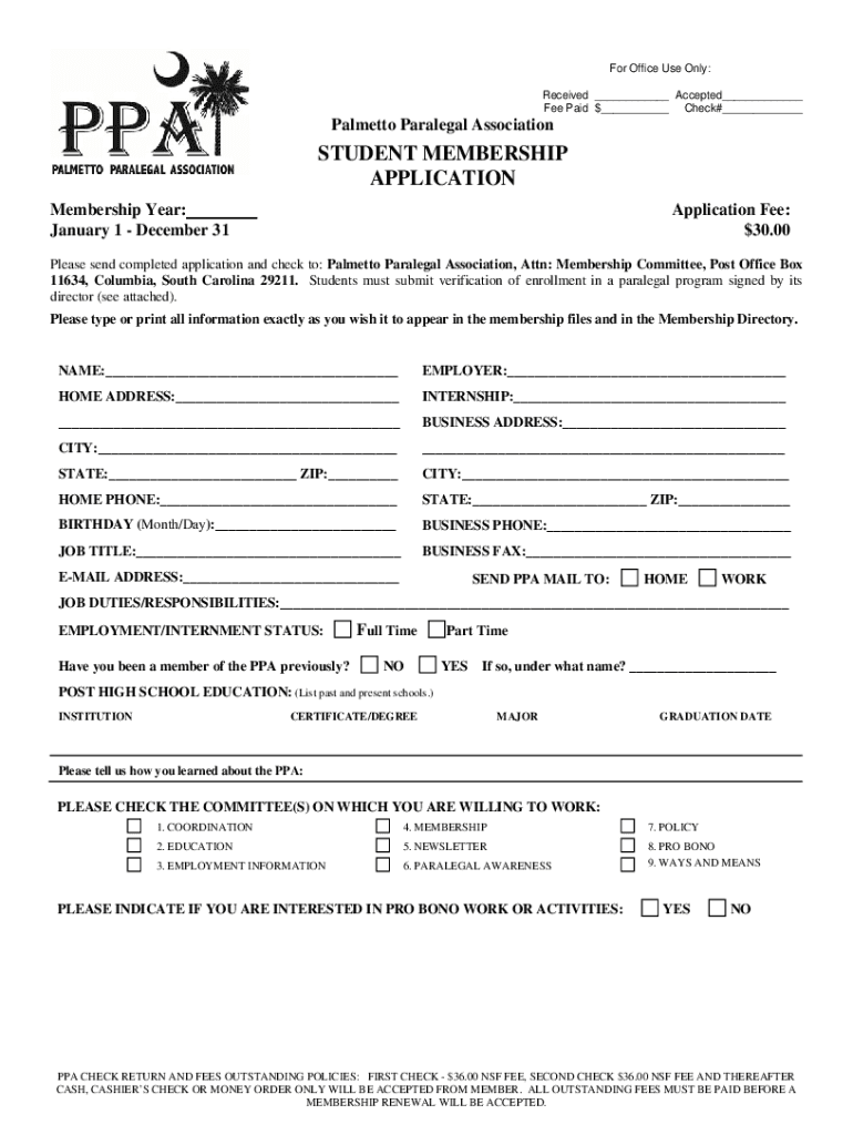 For Office Use Only: Received ___ Accepted___ Fee Paid $___ Check#___Palmetto Paralegal AssociationSTUDENT MEMBERSHIP APPLICATION Membership Year: January 1 December 31Application Fee: $30.00Please