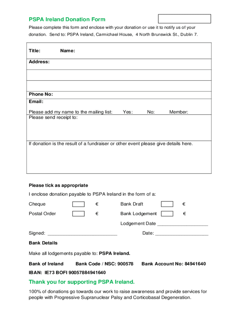To fill out the PSPA Ireland donation form, gather all relevant information regarding the donation, including the amount, date, recipient, and your personal details, and complete the form according to the provided instructions.