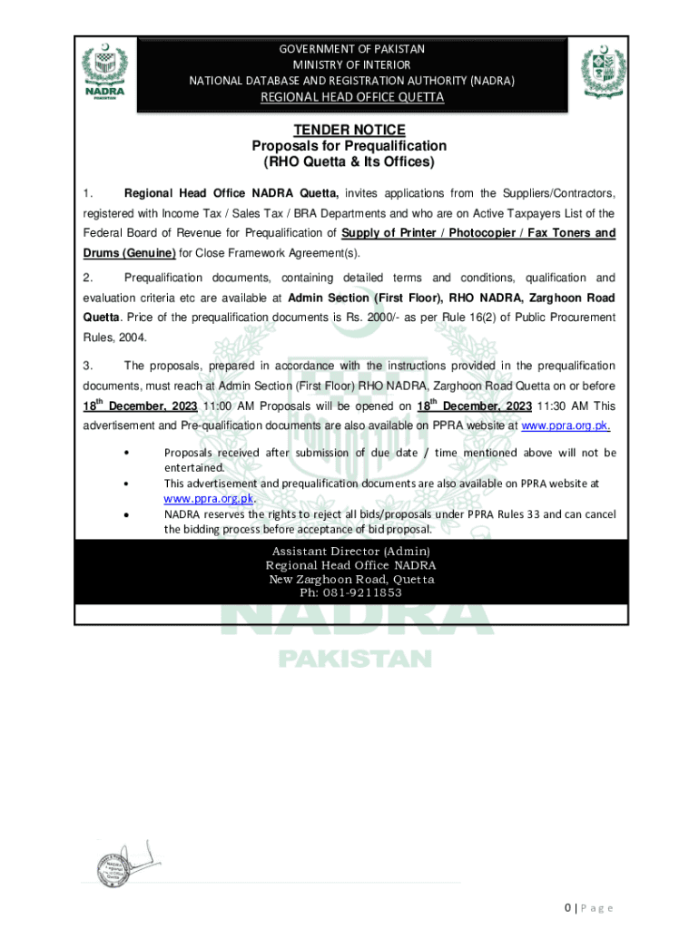 GOVERNMENT OF PAKISTAN MINISTRY OF INTERIOR NATIONAL DATABASE AND REGISTRATION AUTHORITY (NADIA)REGIONAL HEAD OFFICE QUETTA TENDER NOTICE Proposals for Prequalification (RHO Quetta & Its Offices)