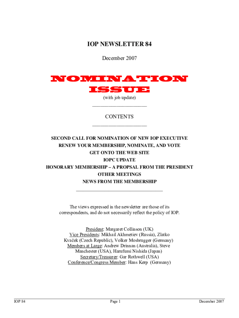 IOP NEWSLETTER 84 December 2007NOMINATION ISSUE (with job update)___ CONTENTS ___ SECOND CALL FOR NOMINATION OF NEW IOP EXECUTIVE RENEW YOUR MEMBERSHIP, NOMINATE, AND VOTE GET ONTO THE WEB SITE IOPC