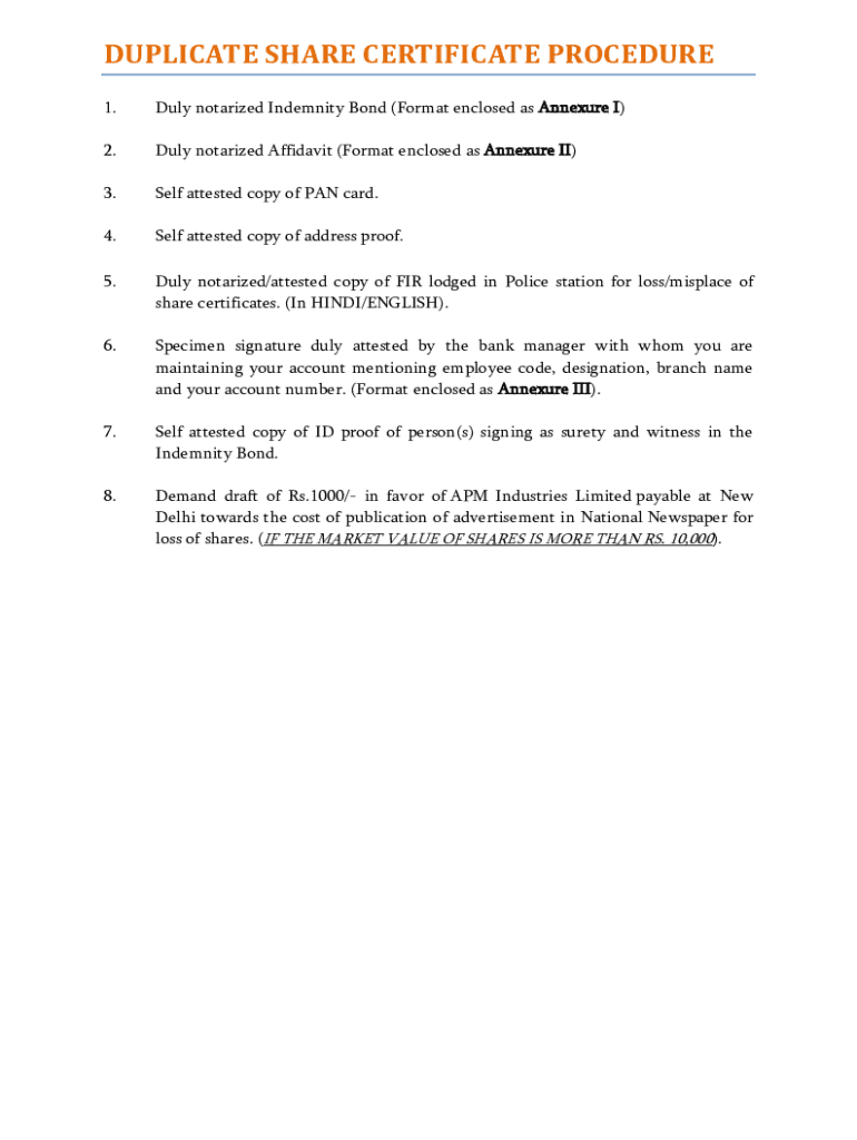DUPLICATE SHARE CERTIFICATE PROCEDURE 1.Duly notarized Indemnity Bond (Format enclosed as Annexure I)2.Duly notarized Affidavit (Format enclosed as Annexure II)3.Self attested copy of PAN card.4.Self