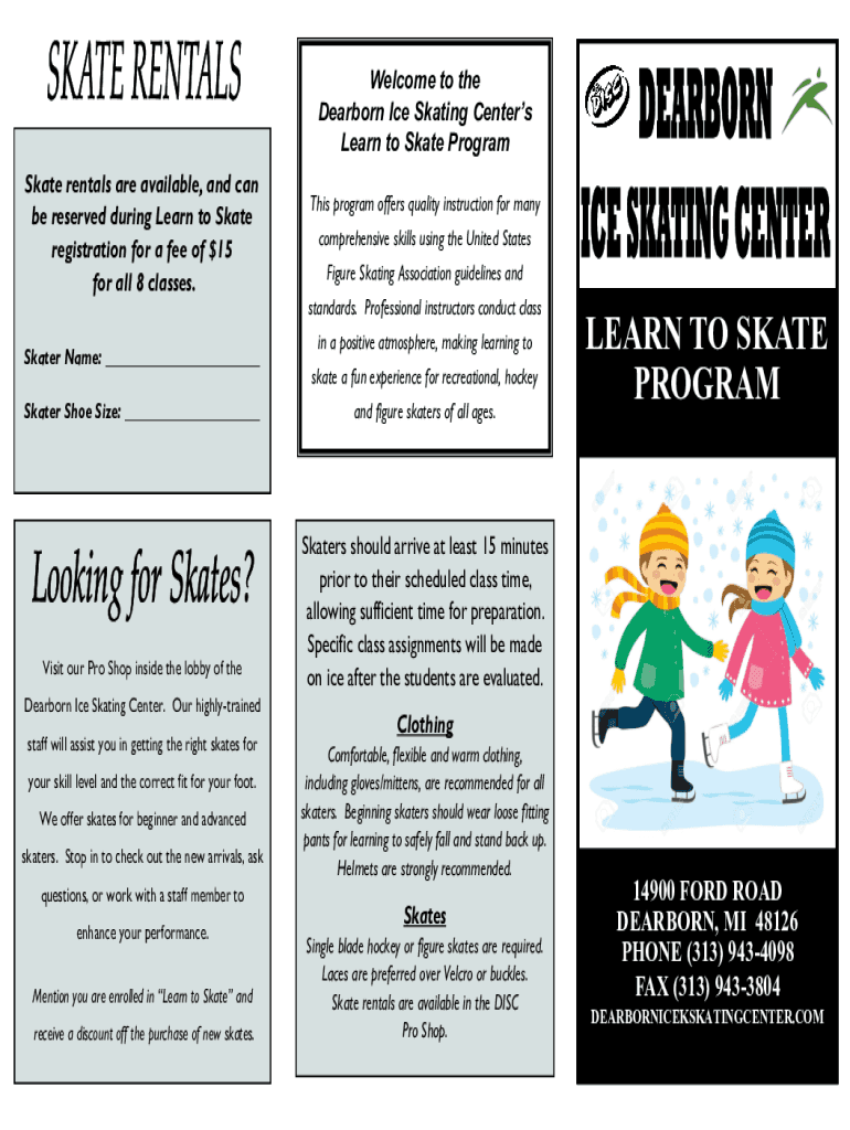 Welcome to the Dearborn Ice Skating Centers Learn to Skate Program Skate rentals are available, and can be reserved during Learn to Skate registration for a fee of $15 for all 8 classes. Skater Name: