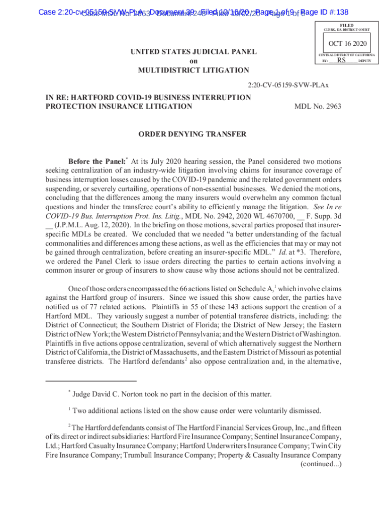 Case 2:20cv05159SVWPLA 39248 Filed 10/16/20 Page 1 of19of Page ID #:138 Case MDL No. 2963Document Document Filed 10/02/20 Page 9 FILED CLERK, U.S. DISTRICT COURTUNITED STATES JUDICIAL PANEL on MULTIDISTRICT