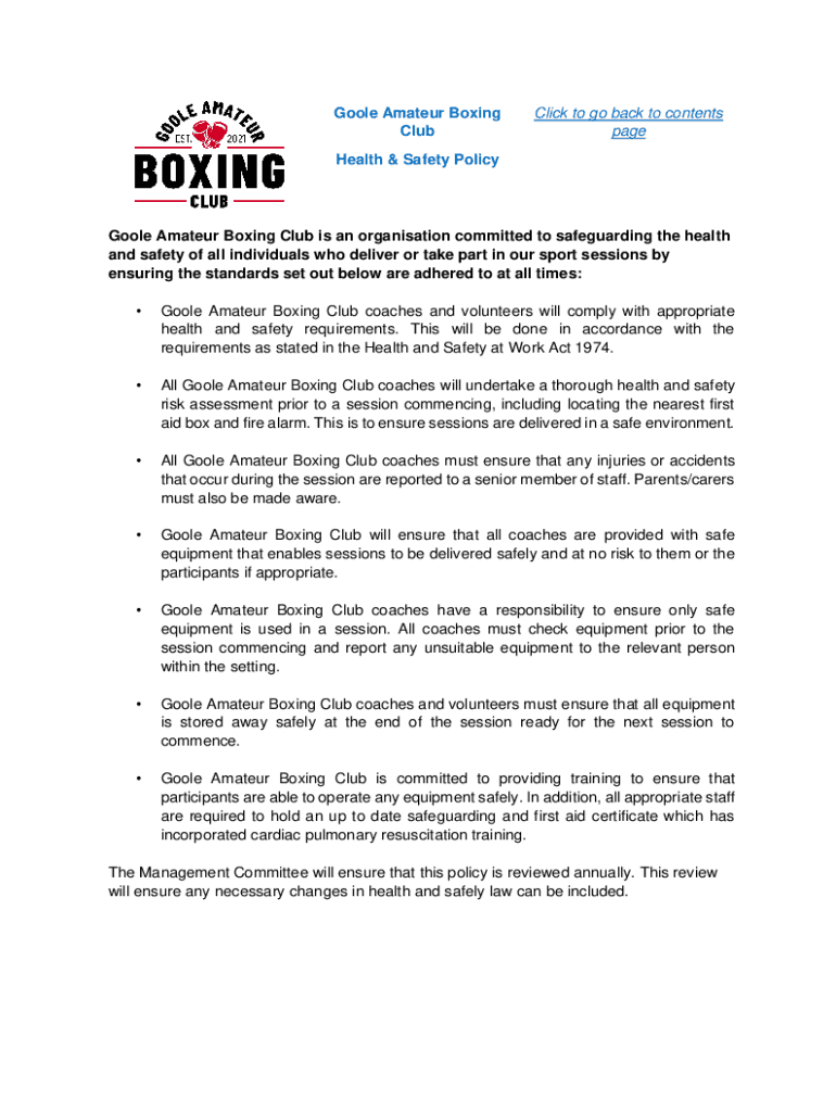 Goole Amateur Boxing ClubClick to go back to contents pageHealth & Safety PolicyGoole Amateur Boxing Club is an organisation committed to safeguarding the health and safety of all individuals who
