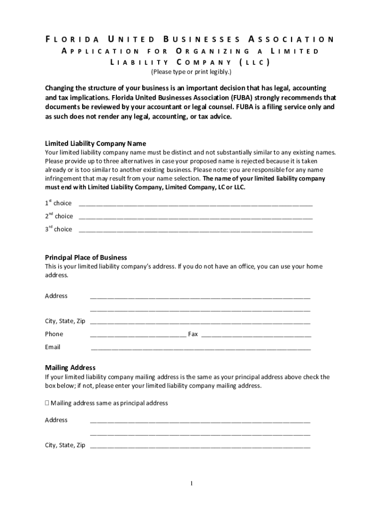 FLORIDA UNITED BUSINESSES ASSOCIATION AP P L I C A T I O NLF O RO CR G A N I Z I N GI A B I L I T Y O M P A N Y (Please type or print legibly.)(LAL L CI M I T E D)Changing the structure of your business