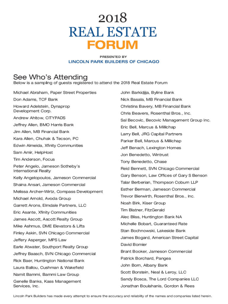 2018 REAL ESTATE FORUM PRESENTED BYLINCOLN PARK BUILDERS OF CHICAGOSee Whos AttendingBelow is a sampling of guests registered to attend the 2018 Real Estate Forum Michael Abraham, Paper Street PropertiesJohn