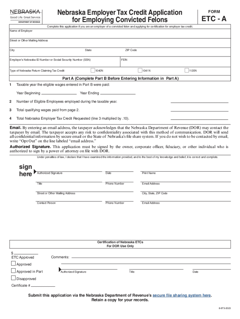 PRINT FORM RESET FORMNebraska Employer Tax Credit Application for Employing Convicted FelonsFORMETC AComplete this application if you are an employer of a convicted felon and applying for certification