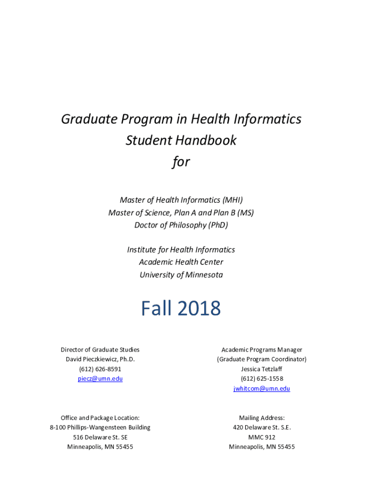 Graduate Program in Health Informatics Student Handbook for Master of Health Informatics (MHI) Master of Science, Plan A and Plan B (MS) Doctor of Philosophy (PhD) Institute for Health Informatics
