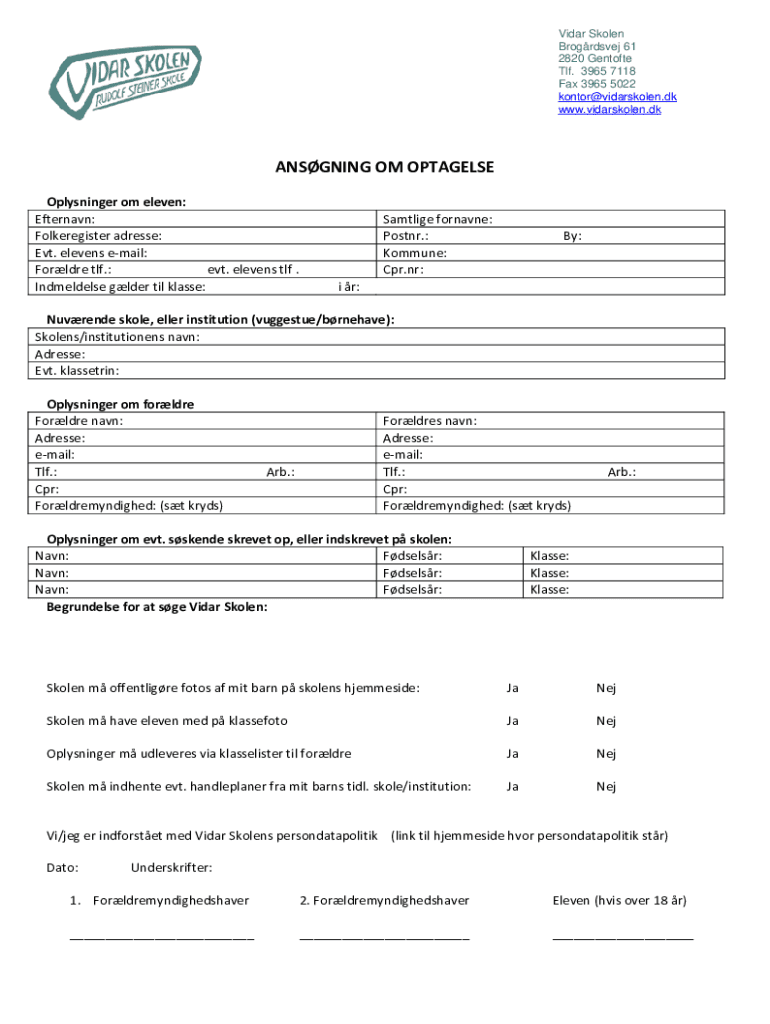 Vidar Skolen Brogrdsvej 61 2820 Gentofte Tlf. 3965 7118 Fax 3965 5022 kontor@vidarskolen.dk www.vidarskolen.dkANSGNING OM OPTAGELSE Oplysninger om eleven: Efternavn: Folkeregister adresse: Evt. elevens