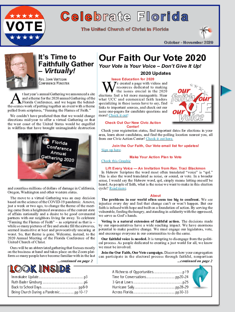 Celebrate Florida The United Church of Christ in Florida October November 2020Its Time to Faithfully Gather Virtually! Rev. John Vertigan Conference MinisterAt last years annual Gathering we announced