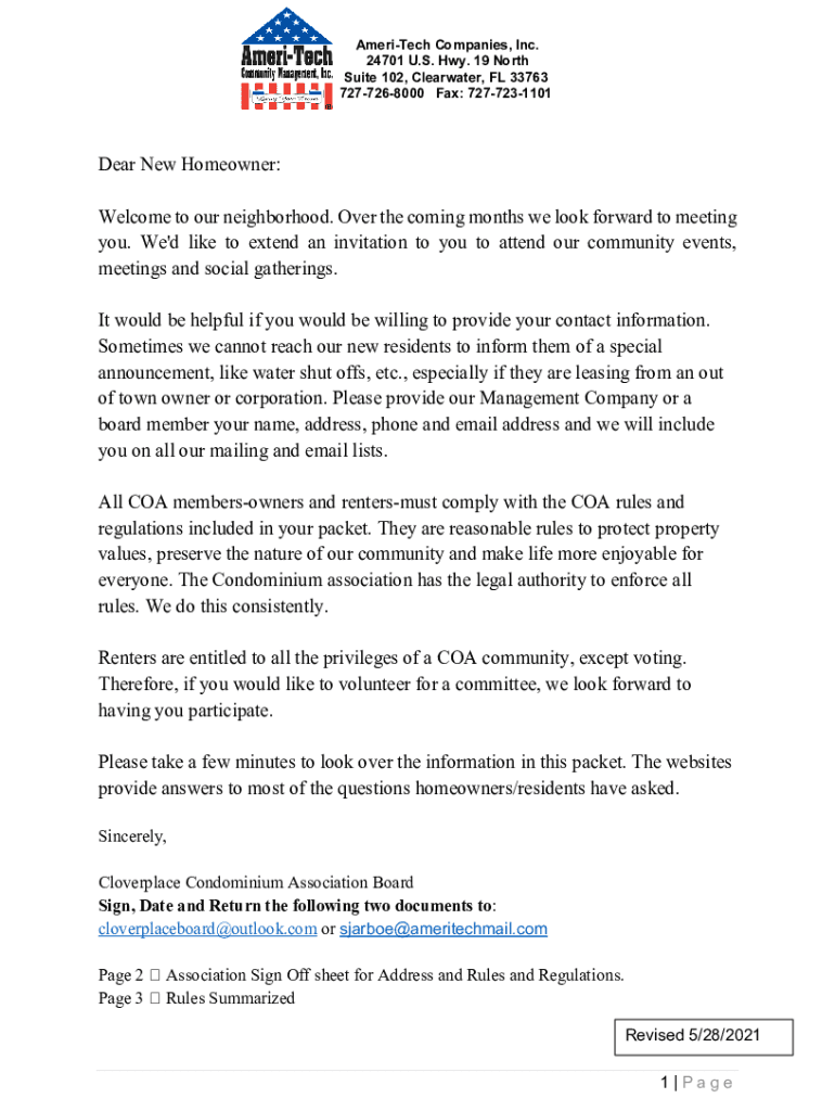 AmeriTech Companies, Inc. 24701 U.S. Hwy. 19 North Suite 102, Clearwater, FL 33763 7277268000 Fax: 7277231101Dear New Homeowner: Welcome to our neighborhood. Over the coming months we look forward