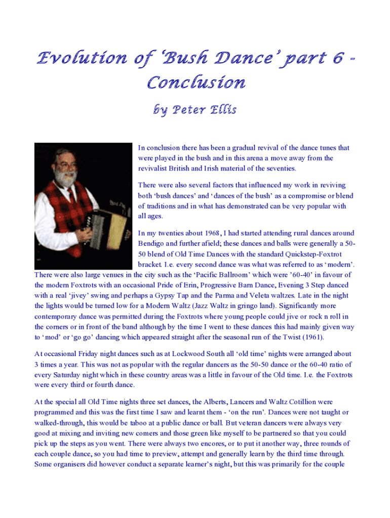 Evolution of Bush Dance part 6 Conclusion by Peter EllisIn conclusion there has been a gradual revival of the dance tunes that were played in the bush and in this arena a move away from the revivalist