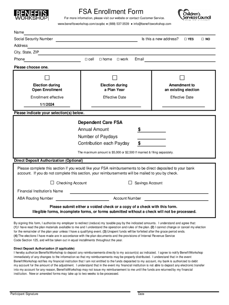 FSA Enrollment Form For more information, please visit our website or contact Customer Service. www.benefitsworkshop.com/cscpbc (888) 5373539 info@benefitsworkshop.comName Social Security NumberIs