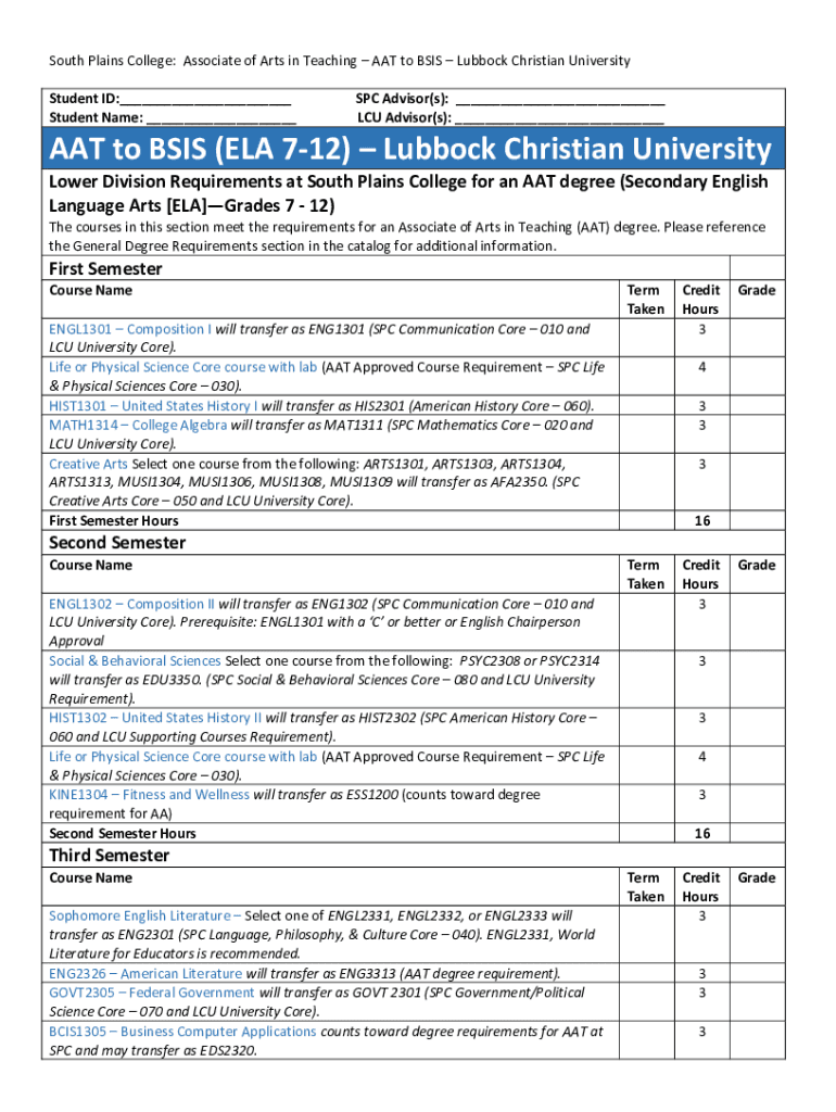 South Plains College: Associate of Arts in Teaching AAT to BSIS Lubbock Christian University Student ID:___ Student Name: ___SPC Advisor(s): ___ LCU Advisor(s): ___AAT to BSIS (ELA 712) Lubbock Christian
