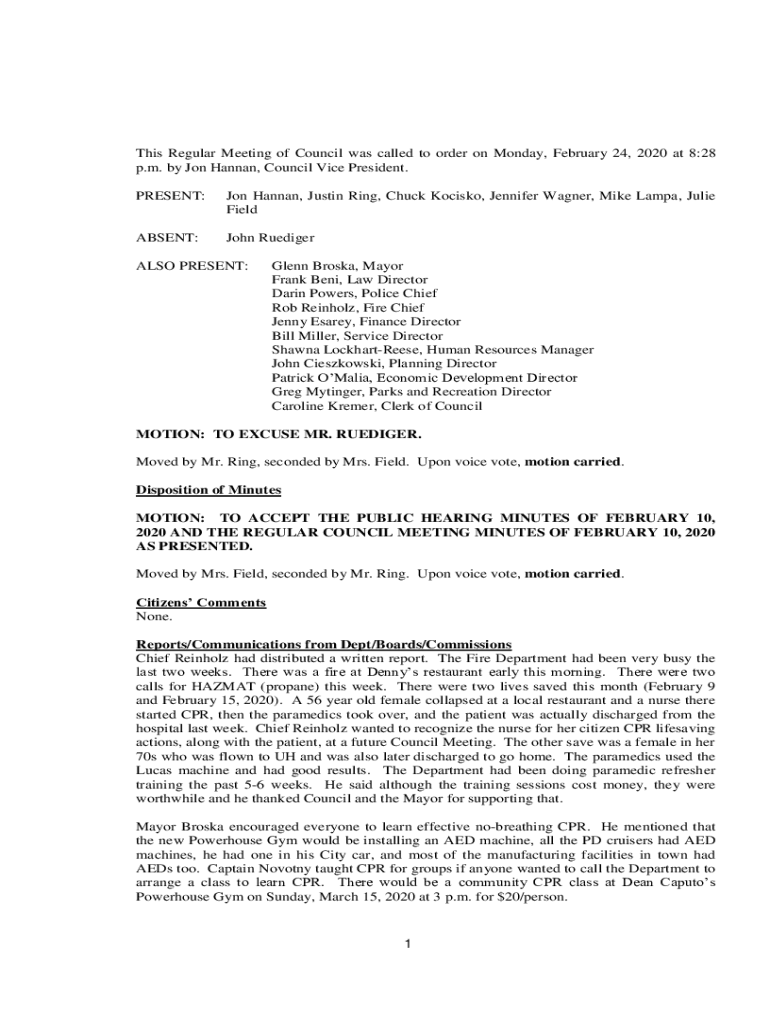 This Regular Meeting of Council was called to order on Monday, February 24, 2020 at 8:28 p.m. by Jon Hannan, Council Vice President. PRESENT:Jon Hannan, Justin Ring, Chuck Kocisko, Jennifer Wagner,