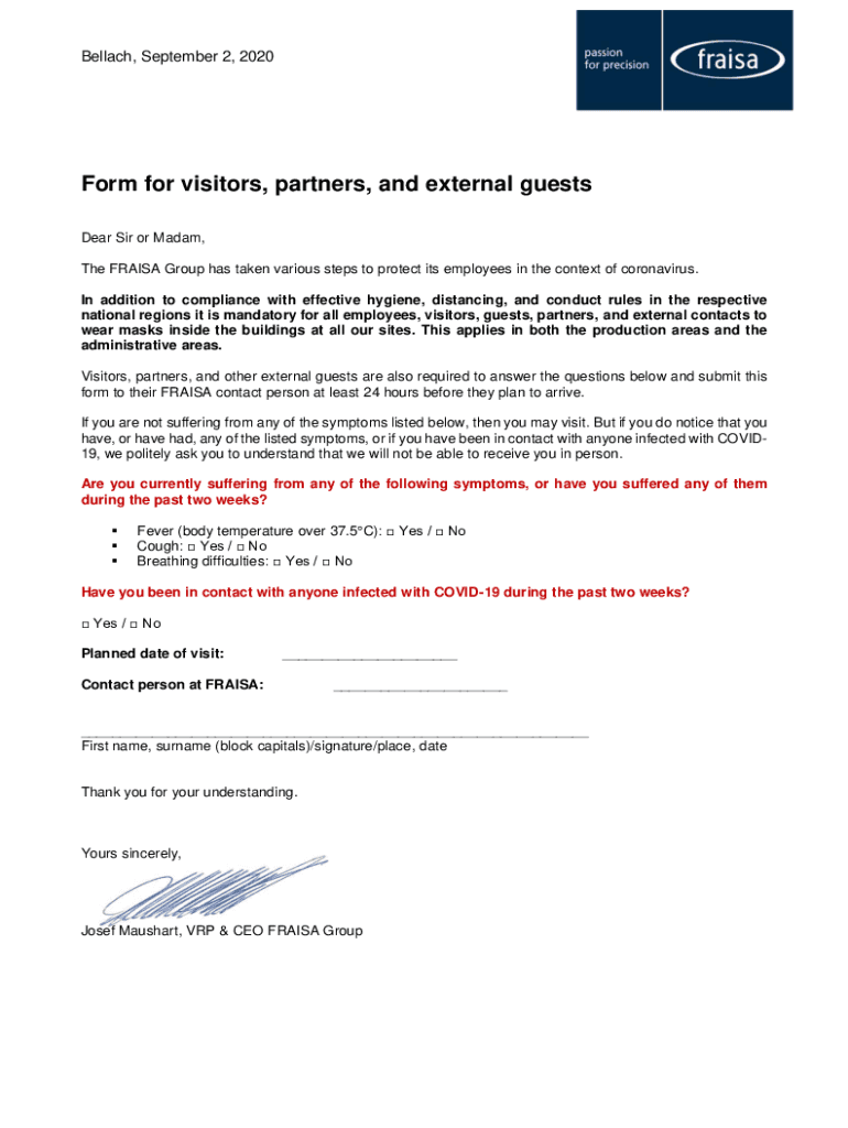 Bellach, September 2, 2020Form for visitors, partners, and external guests Dear Sir or Madam, The FRAISA Group has taken various steps to protect its employees in the context of coronavirus. In addition
